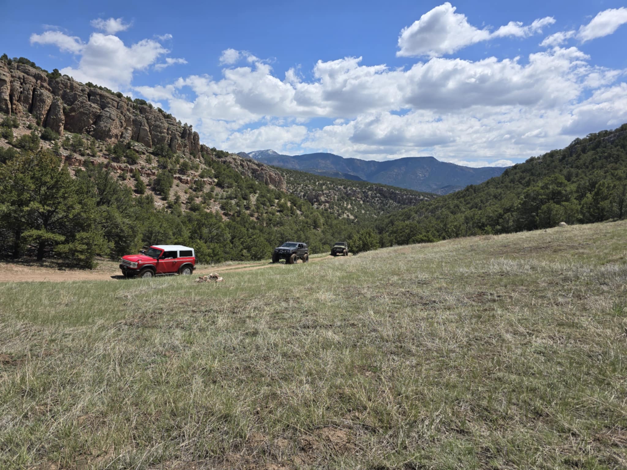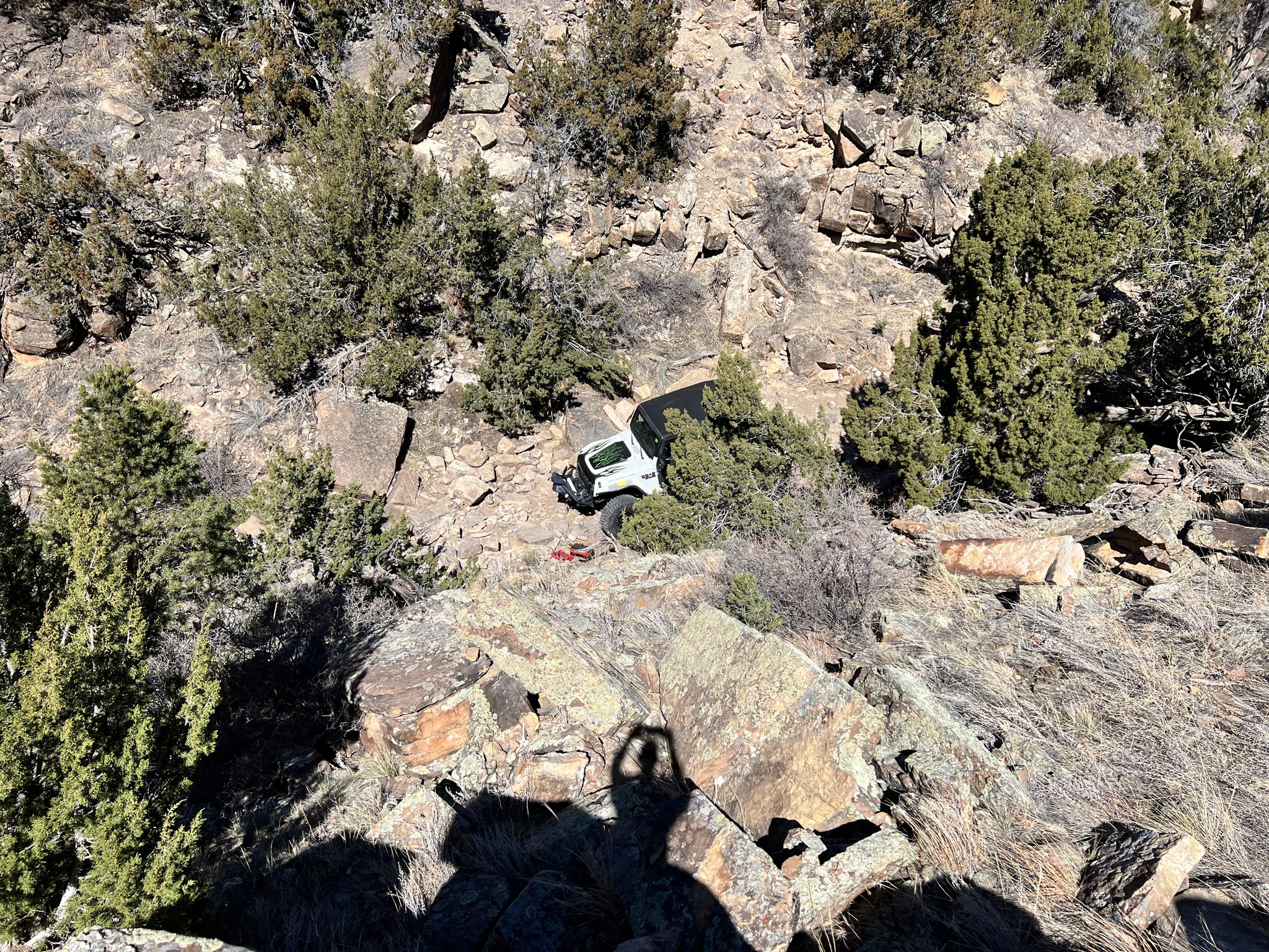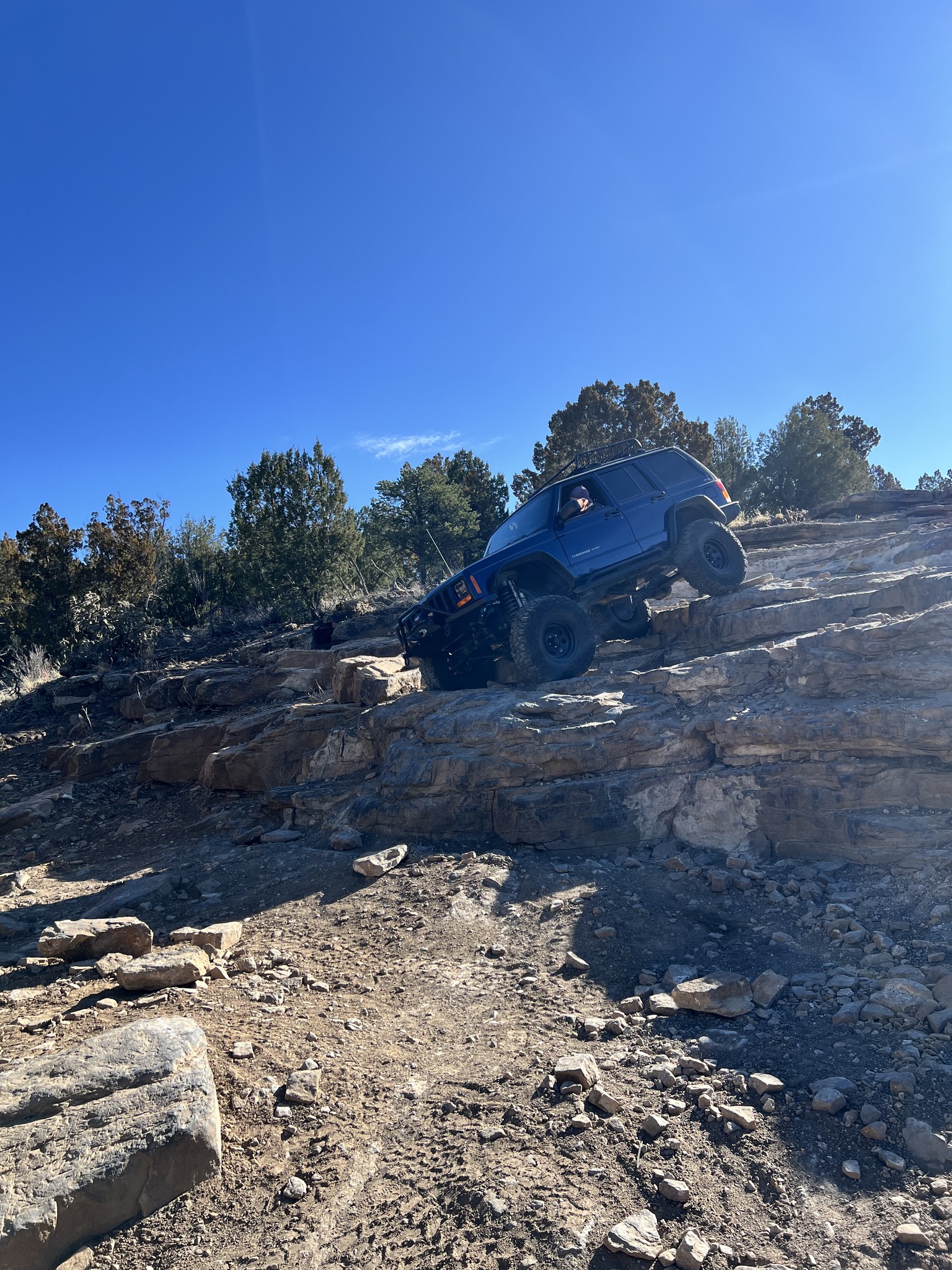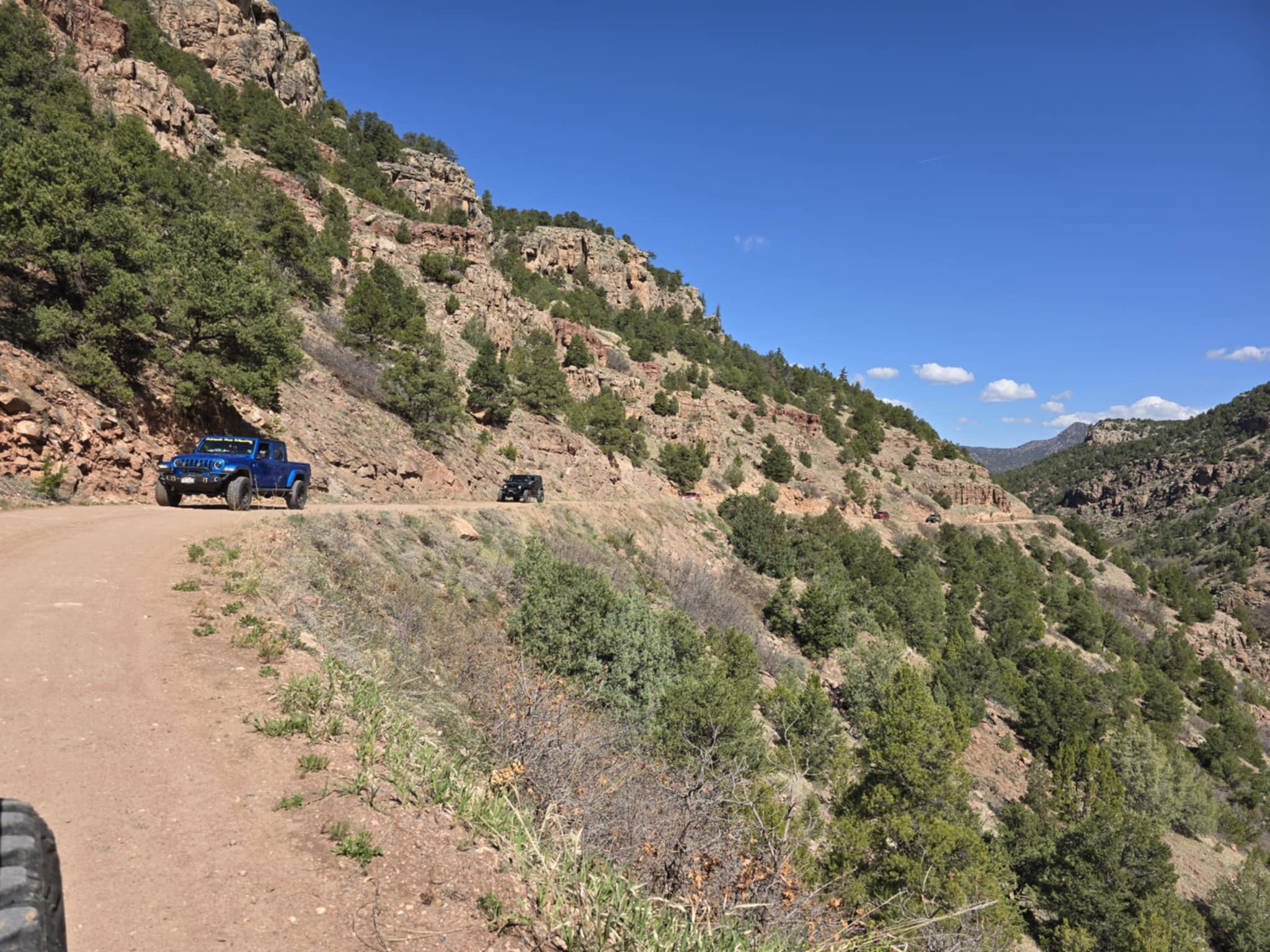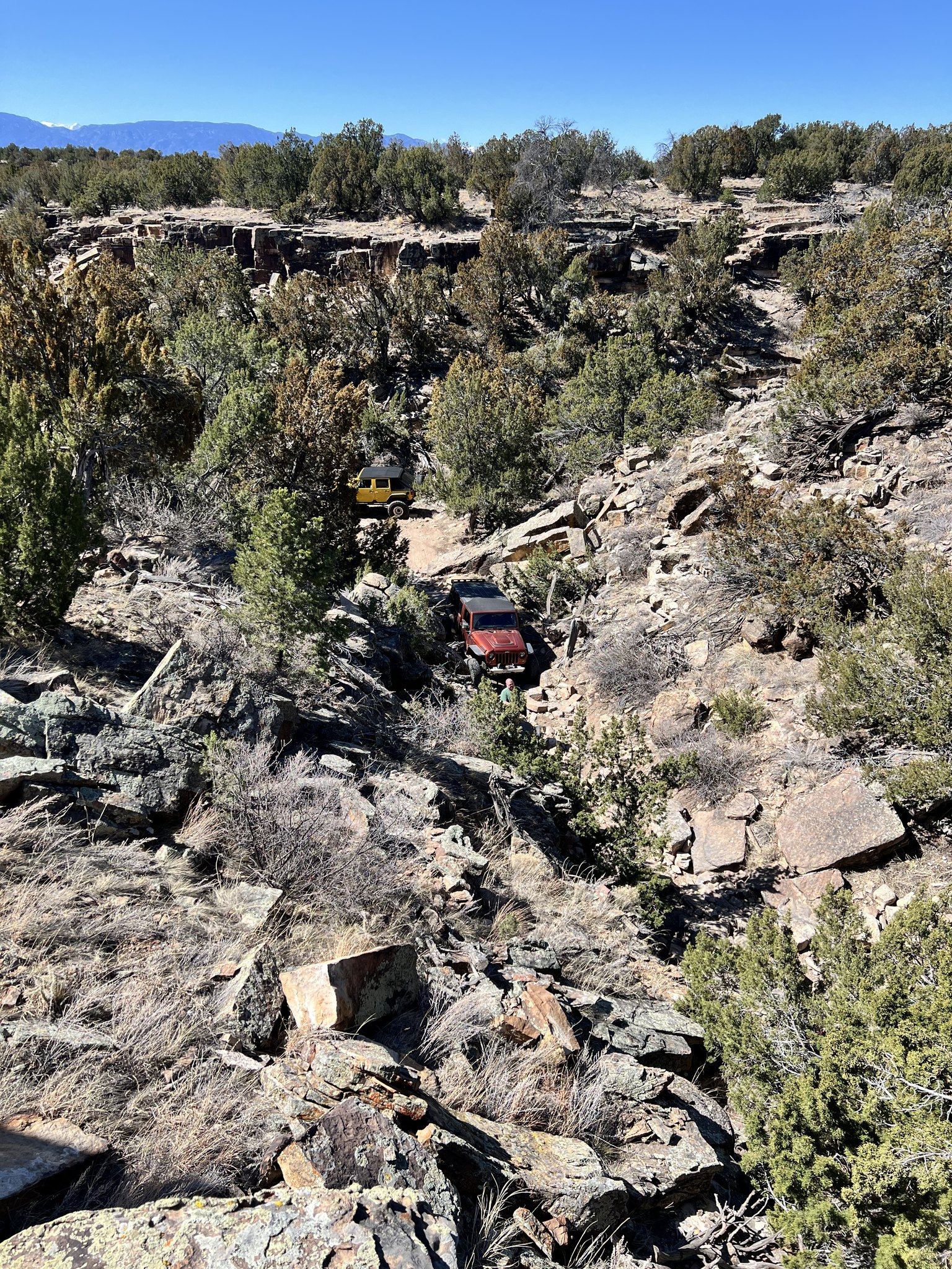 Arrived at trail head approx. 9:30 am and started the decent into the canyon. Very windy on the upper edge but dropped some while in the canyon. Some overgrowth in the trail causing pinstriping and tree dodging. About 3/4 the way in, Chris and Heidi were descending a rock obstacle and broke the driver side tie rod end. We climbed up the canyon wall to get reception on our phones to search for parts and shuttle. Chris had the original tie rod at home and Sandra was able to pick it up from their daughter and bring it to Penrose Commons and meet us.